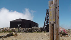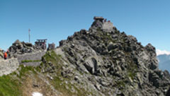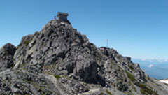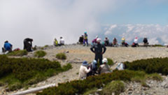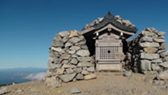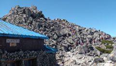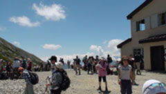 富士ノ折立からは大汝山の休憩舎が目前に見えて岩峰に多くの登山者が列をなしている。10分程で登山者で混雑している大汝山を通過して次のピーク雄山へ向う10分程で雄山の山小屋(売店、休憩舎)の所に着くと大勢の登山者と雄山詣での信仰者及び観光で登って来る人たちで非常に賑わっている。標高3003mの岩峰の頂に社が有り何人か順番を待っている。