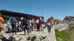 早々に雄山を通過して一の越まで急斜面の下りが続く。室堂から多くの登山者等が登って来る人と団体さんの降る人で所々で立ち止まり交互に通行する状態なのでわき道を選んで岩のごろごろした急斜面を降る。一の越の休憩舎に降ると此処も多くの人で混雑していて、更に室堂から雪渓を登って来る行列も見える。此処で小休止して再び次のピークを目指す。