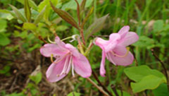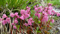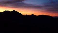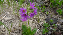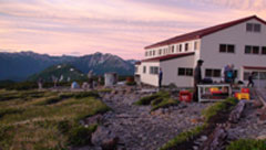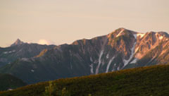 五色が原の一角、木道になるとハクサンコザクラが所々で咲いている。後僅かな道程だが木道の途中で5分ほど休憩して喉を潤し16:30分、体力の限界ぎりぎりで五色が原山荘に到着。夕食までの時間外のテーブルでビールを飲みながら夕焼けに移り変わる山並みを眺めながら至福の一時に浸る。