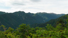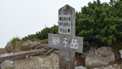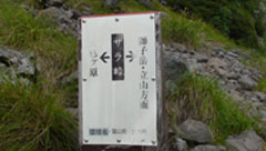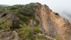 標高2741mの獅子岳山頂に13:40到着、此処で再び休憩していると若い男女4名の登山者が追いついて来て一緒に休憩する。眼下にはザラ峠から五色が原に伸びる登山道が続く。獅子岳からは標高差400mを一気に下る急斜面で途中に梯子もあり膝に負担が掛からないようにゆっくりと降る。