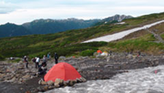 18日 昨夜の星空に引き続き、本日も朝焼けが綺麗で十分山の景色を堪能できる。早朝の散歩後、朝食を済ませて5:15分五色が原山荘を出発する。既に10名ほど先にダムサイトに向った様だ。雪渓の残るキャンプ場を過ぎてチングルマの群生する広い五色ケ原を槍ヶ岳目指して進む。300mほど先にダムサイトに向う4名の登山者が見える。