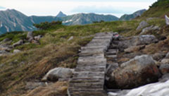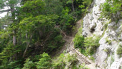 8:10分黒部湖畔の平乃小屋に出る。途中で追い越した4人のグループも直ぐに小屋に到着して休憩する。沢水で冷やした缶コーラ250円を求めて水分の補給と20分ほど休憩していると後続の2名が到着し僅かな休憩で先発する。此処からは平坦な山道と予想して来たが登り降りも多く崩落した所を迂回する丸太の梯子の連続で80m程降り再び丸太の梯子で80m程登り元の登山道に迂回したり予想以上に難路で時間も費やす。