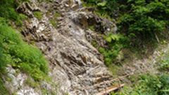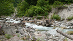 沢に降り丸太の橋を何度か渡り、梯子の迂回路も数箇所有り、道程が長く何度も小休止して水分の補給をしながら平乃小屋から4:10分ロッジ黒部に到着、再び自動販売機でコーラを買って飲む此処で平乃小屋での4人のグループ一緒に休憩となる。