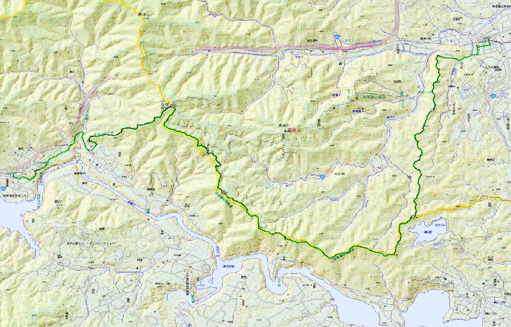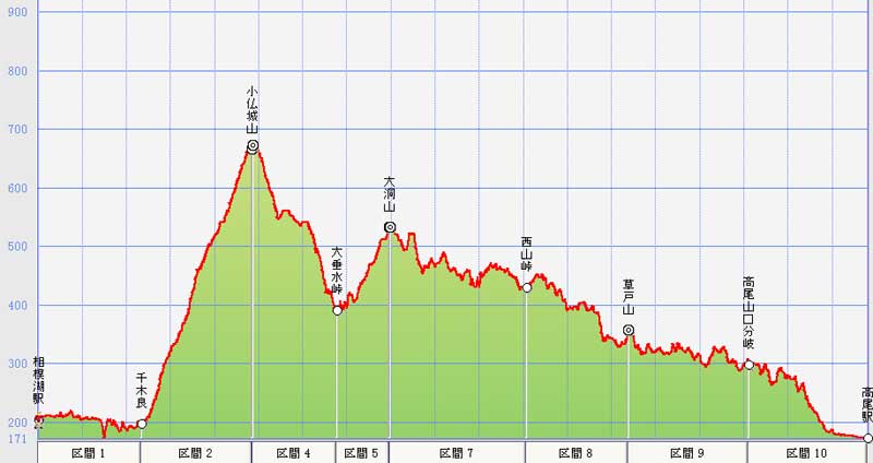 相模湖駅8:00→千木良8:50→小仏城山10:05〜10:47→大垂水峠11:30→大洞山12:00〜12:55→西山峠→三沢峠14:05→草戸山14:30→高尾山口分岐15:48→三和団地登山口16:20→高尾駅16:50