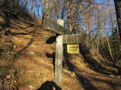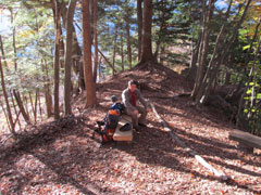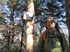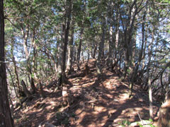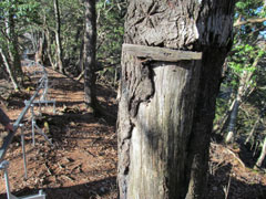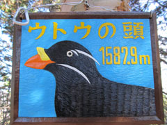 痩せた尾根筋の針葉樹林帯に入りピークにウトウの頭の標識が二つ木に掛かっている各所の標識はいずれも有志が手作りで設置してあり始めての登山者には大いに助かる。ウトウの頭からは露岩の合間を下り倒木などで遮られた登山道を登り、岩の多い狭い尾根筋の道が不明瞭になり左側を巻いて50mほど下ると鞍部(コル)に出る