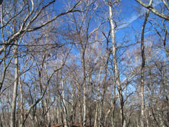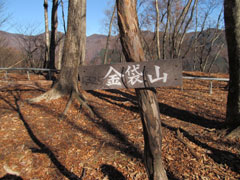 右手の方向からモノレールが敷設されていて尾根筋の登山道と平行して金袋山1325m、スズサカの丸1456mの先で左の谷に下りている。金袋山はミズナラの大木が多くあり