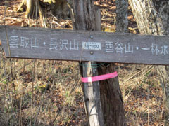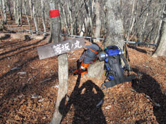 モノレールの終点を過ぎて僅かに行くと朽ち掛けて文字がはっきりしないがガラ滝の頭と思われる標識が木に掛かっている(13:45分)。再び緩やかな尾根筋を登って行くと広い尾根になり長沢背稜縦走路に出る。ほぼ予定どうりタワ尾根を登れて気が楽になる。此処には分岐の標識は無く分岐点にトラロープが5mほど張ってあり中心に、この路は途中で行き止まりの警告が札が吊るしてある。