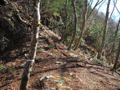 所々で朽ちた石段の痕があり登山道と確認できる。今回のコースは登山ルートとして地図には赤線で表記されていないタワ尾根を長沢背稜の縦走路まで登るコースだが