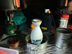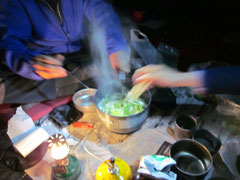 鷹巣山から来た男性、よこすず尾根を登ってきた男性と男女グループの総勢6名で各自持参のビール、お酒、焼酎、ワインで宴会が始まる。話題はもちろん登山の事で北海道から九州まで日本全国の話で意気投合する。8時頃には全員食事の後片付けを済ませてシュラフにもぐりこむ。お酒を飲み過ぎた影響で熱くて眠れず外に出てみると満天の星空で遠くに都心の明かりも見える。体も冷えて来たので小屋に入ってシュラフに潜り込む。