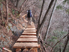 日向谷ノ頭、坊主山、七跳山、大栗山、天目山と続く峰の南側1550m付近を、ほぼ水平に登山道が出来ていて右手石尾根の後方に富士山を眺めながらの快適な歩きが出来る。所々で切れ落ちた沢には桟道が整備されていて安心して歩ける。七跳尾根の分岐点で小休止後、大栗山の山腹を通過してハナド岩で再び小休止、石尾根方面の展望が良い。