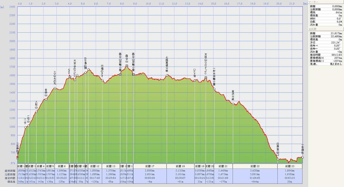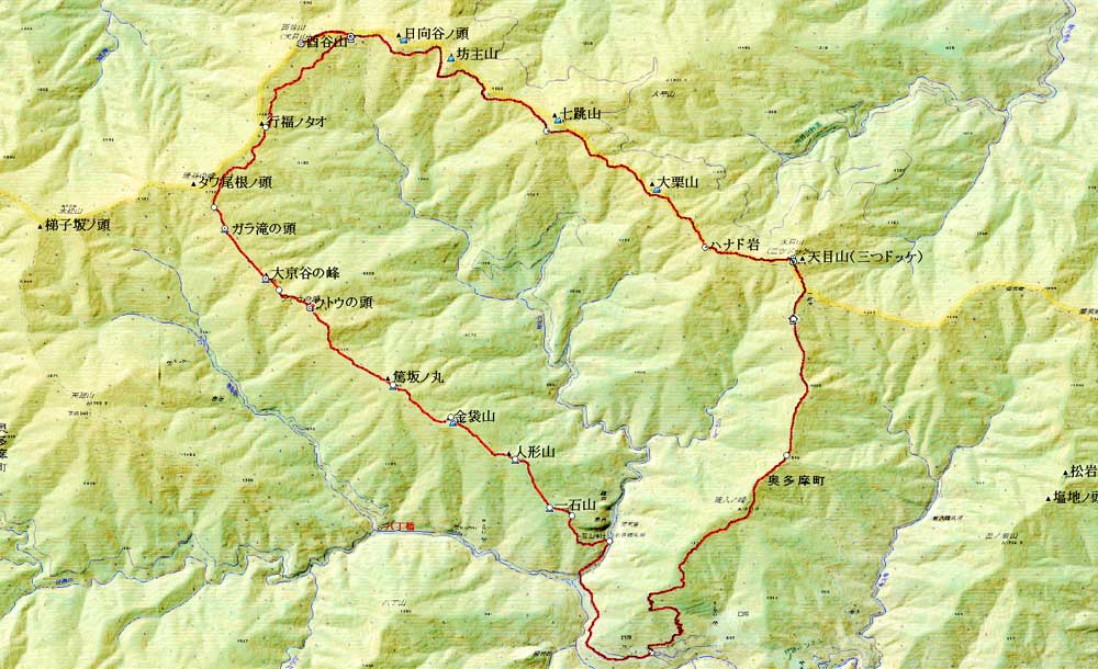 奥多摩駅7:20⇒一石神社7:45→一石山9:05→人形山9:35→金袋山10:15→スズ坂の丸10:45→ウトウの頭11:45〜12:20大京谷のクビレ12:56→大京谷の峰13:26→ガラ滝の頭13:45→縦走路14:10→酉谷山避難小屋
