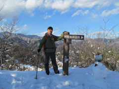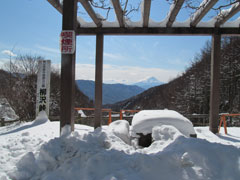 山頂は30センチほど雪が積もっていて雪山登山を味わえる。岩殿山最高地点の烽火台には電波塔があるが周りの樹林であまり展望が良くない。大岩の上部に当たる所は展望がよく休憩舎が在るので此処で真正面の富士山を眺めながら遅い昼食にする。