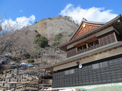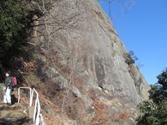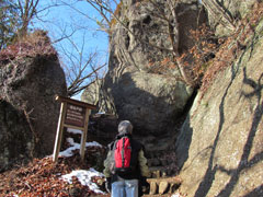 急斜面の登りで苦しい所だがゆっくりと景色を眺めながら登ると円山公園の標識があり門を潜ると2階建ての資料館がある。秀麗富嶽十二景(撮影 白旗史郎)等のパンフレットがあり写真等の展示があるようだが入館しないで山頂を目指す。頭上に迫る大岩を見上げながら急な斜面に出来た階段をジグザグに登り岩の門を抜けて山頂の一角に出て北側の展望も開ける。