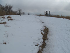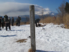 山伏平の標識がある所から21世紀の森への分岐があり直進すると積雪が30センチほどになって来て急斜面の登りとなる。上から20名ほどの団体さんが降りてくるので立ち止まって通過を待つ、数回スリップしたが軽アイゼンを装着しないでどうにか登りきる。登山道が緩やかになり枯れススキに囲まれた矢倉岳山頂に出る。空を見上げると南側は灰色の雲で北側は青空で次第に雲が南に移動して行く。