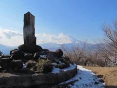 13:00分登山者が去って再び静かになった矢倉岳山頂からは富士山もほぼ全容が見えて来たので引き返すことにする。急斜面の下りがあるので軽アイゼンを装着して行く。急斜面の雪が凍っている所でも安心して確実に下れる。山伏平、地蔵堂分岐1、地蔵堂分岐2を通過して万葉広場分岐から尾根筋の道に移動して万葉歌詞を見ながら万葉公園Pに戻る。