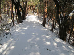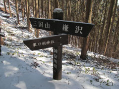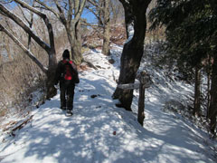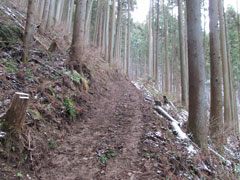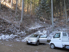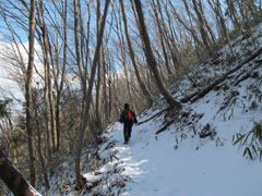 友人のKAさんに誘われて生藤山に登ってくる。コースは車を使用するため石楯尾神社のから林道を入って林道の終点まで車で入る。今日は平日で林業関係者が搬送用道路の整備でゲートが開いている。昨日降った雪で路面が一部白く成っていたが凍ってはいないので難なく車で入れる。早速佐野川峠目指して新しく出来た林業用の登山道を登って行くと小型重機で道路の拡張をしている。