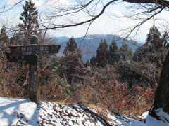 再び林の中を緩やかに登って行き、軽く小山を越して緩やかに下り目前の小さな山頂を巻き道を右手に見送り上り詰めると三国山山頂に出る。此処も西側の展望が良く富士山も良く見える所だが雲に完全に隠れてしまい残念だ。山頂は千葉から来た2名の登山者と私達二人で静かな山頂で軽い食事をする。