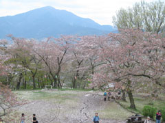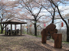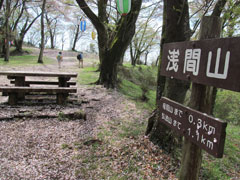 浅間山を緩やかに下ると車道が横断していて駐車場とトイレの設備がある。車道を越して緩やかに登って行くと頭上に権現山の展望台が見えてくる。急斜面を登り切ると権現山の山頂で桜に囲まれた広い山頂は多くの桜花見の人で賑わっている。2001年に建てられた展望台に登って上から桜を眺められる。富士山がくもに隠れて見ることが出来なかったのは少々残念だ。此処、権現山は関東の富士見百景の一つになっている。