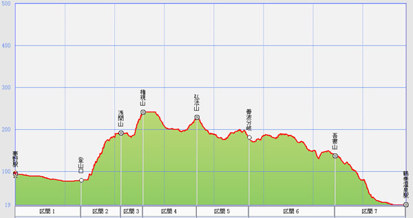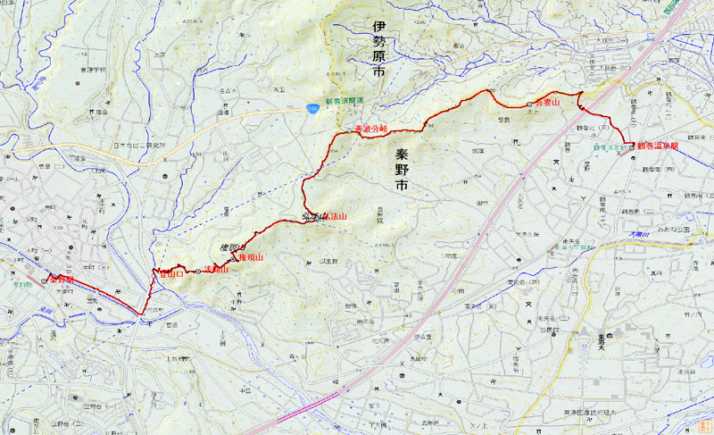 賑やかな弘法山237mを後に吾妻山(鶴巻温泉駅)に向う途中で左に善波方面の道を見送り緩やかに下って行き休憩舎のある吾妻山で小休止して再び下って行き民家のある所に出て高速道路の下を潜り街中に入って鶴巻温泉駅に12:15分到着。近くに弘法の湯もあり一風呂浴びても帰れる。