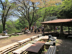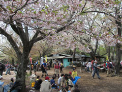 景信山から小仏峠を通過して小仏城山に登って見ると景信山より更に多くの登山者等で賑わっている。満開を過ぎた桜の元で各自ビール、おにぎり、お弁当、等で昼食を楽しんでいる。一丁平から日影沢林道に下り再び沢沿いの道を多くの花を見ながら日影沢バス停まで降る。