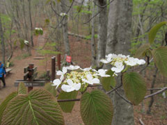 満腹になったので三頭山山頂を後にムシカリ峠に下る名前の通りムシカリ(オオカメノキ)白い花が咲いている。此処ムシカリ峠から都民の森駐車場に戻れるが少し遠回りする大沢山を目指して直進すると直ぐのトイレ施設のある建物がある。