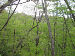 暫く小さな上り下りを繰り返す岩のゴロゴロしている登山道で右手側が植林地帯で暗く左手側はブナ等の新緑が新鮮で左右対称的だ。