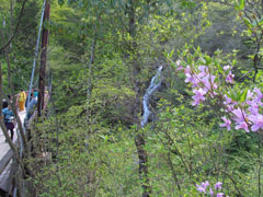 三頭大滝は数十メートルの落差があり見学用の吊り橋もあり寄って見てゆく橋も袂にはピンク色の三つ葉つつじも咲いていて滝を引き立てている。