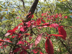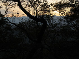 仏果山山頂は誰もいないし太陽が低くなり丹沢の山に隠れる前に下山したいので5分ほど水分補給で休み、直ぐに引き返す。慎重に岩場を通過して右手に赤く染まって行く空と次第に黒く変わって行丹沢山塊のシルエットを見ながら明るいうちに半原越に戻れる。