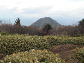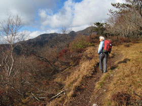 昨日の雨が去って青空に成って来た7日栃木県の高原山 釈迦ケ岳へ友人三人で行くYAさんの案内で登山口の大間々台に駐車して釈迦ヶ岳を目指す。麓は紅葉が最盛期で素晴らしい景色の中登って来たが大間々台から山頂方面は紅葉は既に終わっていて枯れ木の山で見透しは良い。明るい雑木林の中を登って行き左側が突然開けて前方にこれから目指す釈迦が岳と頭だけ釈迦が岳の後方に鶏頂山が見える。山頂付近は雲があるが刻々と変化して流れてゆく。