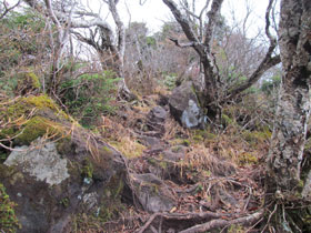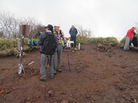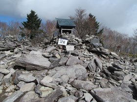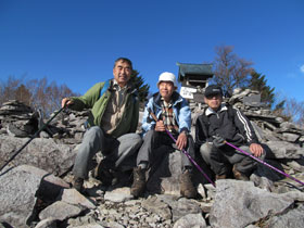 丁度12時で20名ほどの登山者が居て各自昼食と休憩中で、我々も早速昼食の準備、今日のメニューは、お赤飯、カレーラーメン、お寿司等で食後のホットコーヒーは体が温まり実に美味しい。食事が終わる頃、雲行きが悪くなり霰が舞って来たので急いで下山準備をして霰と風が舞う中を山頂を後に往路を降る。雷も聞こえて来たので急いで下山したが八海山神社に戻った時は霰を撒き散らした雲は流されて青空に急変して暖かい日差しが射してくる。