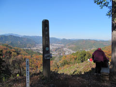 数回アップダウンを繰り返すと左200m、天狗岩の標識があり、標識に従って階段状の斜面を30mほど降って行き僅かに登ると岩が突き出た展望が良い所(天狗岩)に出る。吉野梅郷の先に高水三山が至近距離で望める。先ほど降った階段を登り尾根筋の道に出て先に行くと直ぐに赤ボッコの標識があり展望が開ける(今回一番の展望)此処で昼食にする。無線でSAさんを呼んだが今日は応答がなし。
