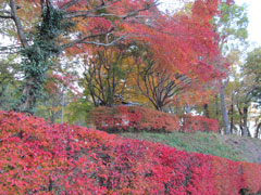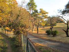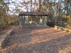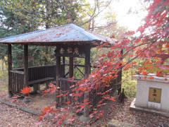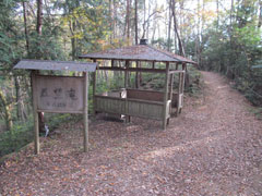 馬引沢峠からは人影も見えない尾根筋の落ち葉に木漏れ日がまだらに当たる道を緩やかに上り下りを繰り返して行く。二ツ塚峠の先で道路を渡り再び尾根筋の道を行く。機動隊関係の記念碑や庵(休憩用)が連続してあり、右手下の方にはグランドが見えて人影も見られる。