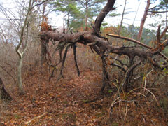 スリップに注意しながら慎重に下り、沢井沢ノ頭まで引きかえす。沢井沢ノ頭から稜線と分かれて左手方向菊花山目指して急斜面を降って行く。前方下に見えていた菊花山が次第に見上げる様になりコルを過ぎて登りになり、大きな石が露出している菊花山643m山頂に出る。