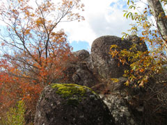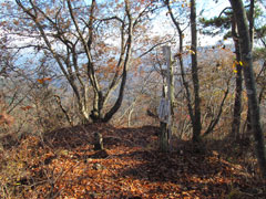 駅から登山口までが少々迷うが山を目指して(南西方向)行けば九鬼山登山口の標識があり。此処から山道となり雨で濡れた落ち葉で滑りやすいのでゆっくり確実に足を進めて登る。山頂付近では雨雲が風で流れて行き少々雨も降って来るが雨具に着替えるほどではない。尾根筋の急斜面を上り詰めると緩やかな登山道になり、神楽山と御前山の間のT字路に出る。神楽山を往復して御前山に向かう。