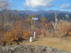 15分ほど休憩後馬立山を目指す。緩やかな上り下りや小さな峰を巻き道で越えたりする登山道で右手(北側)方向は雲が殆ど無くなり滝子山から大菩薩嶺に連なる山並みや百倉山、扇山等が良く見える。沢井沢ノ頭の直前で右手から急斜面を数人の登山者が息をきらして登って来る。(帰路利用する菊花山への登山道)