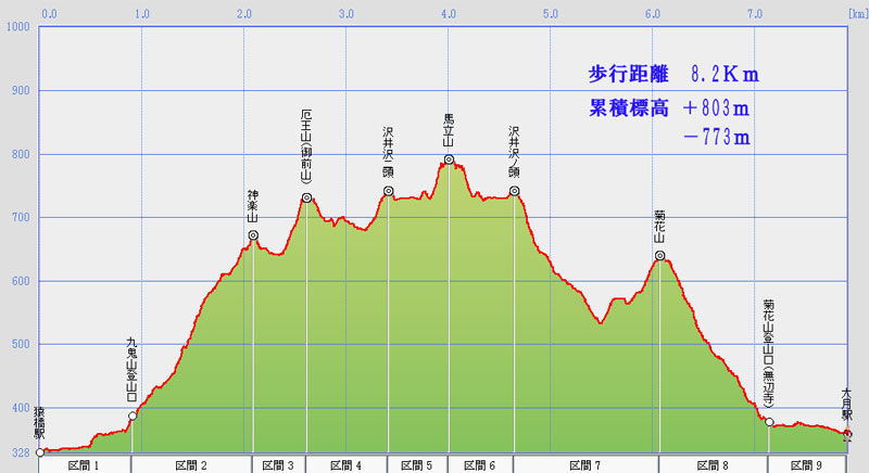 猿橋駅8:45→九鬼山登山口9:00→神楽山9:55→厄王山(御前山)10:20→沢井沢ノ頭11:00→馬立山11:20→沢井沢ノ頭11:50→菊花山12:40〜13:00→無辺寺13:40→大月駅13:50