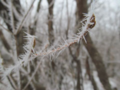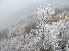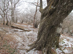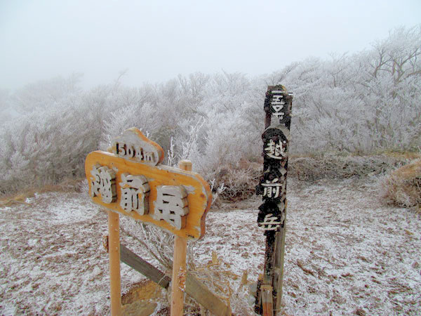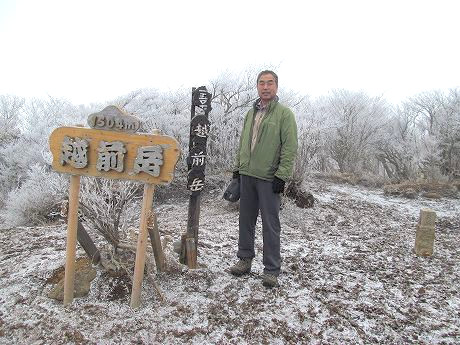 山頂に近づくにつれて足下も白くなり、見上げれば木の枝に白く霧氷が輝いている。時折雪雲が流れてきて粉雪を振り掛けて来るが雨具に着替えるほどではない。人の話し声が近くなり霧氷のトンネルを抜けると標高1504mの越前岳山頂に出る。呼子岳から登って来た同年代の男性登山者が2名休憩していて5分ほど一緒に話をしたのち十里木に降って行く。一人になった山頂で暖かいコーヒーとお赤飯とパンで遅い昼食にする。幸い気温は低いが風も弱いので山頂でしばらく景色を楽しめる。