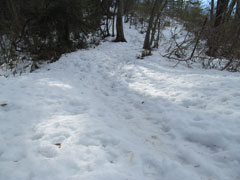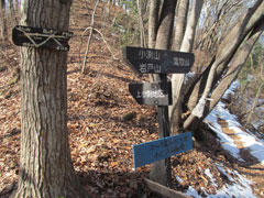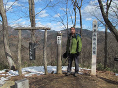 予定より早く着いたので山頂でゆっくり昼食休憩。無線のフレンド局をコールしてみたが陣馬山の陰で東京方面は電波が届かないようだ。12:10分早いが十分休憩も出来たので山頂を後にする。北側斜面の下りで残雪が15Cmほどあり雪山登山の気分を少々味わえる。20分ほどの下りで鷹取山登山口の標識がある車道に出る。12:30 後は約一時間車道を歩いて上野原駅に向かう。上野原名物の酒饅頭を買って電車の中でお茶と酒饅頭を味わいながら帰宅の途に着く。