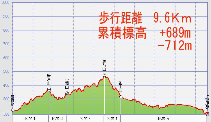 藤野駅9:25→岩戸山10:10→小渕山10:35→鷹取山11:30〜12:10→鷹取山登山口12:30→上野原駅13:20