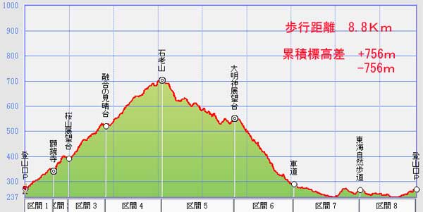 登山口P→顕鏡寺→桜山展望台→融合の見晴台→石老山山頂→大明神展望台→東海自然歩道→登山口P