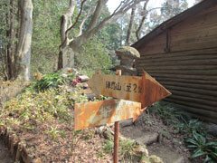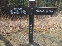 底沢峠からは枝道から幹線道路に入って、登山者、ハイカー、ランニング者、マンテンバイクと行き来をする者が多くなる。6分ほどで明王峠で少々早いが軽い昼食にする。陽当たりの良いベンチで昼食を摂っているとエンジン音が近づいてきてミニトラクターで荷物を載せて来た小屋の管理人が登って来て開店準備の様子だ。トイレの設備もあり休憩ポイントになっていて20名ほど休憩している。 11:50陣馬山を目指して行くが所々で強風に煽られて帽子が飛ばされそうになる。花粉、黄砂等が舞って居るので遠望は霞んでいて特に南側は視界が悪い。登山道には全く雪が無く床も程よく湿っている状態で歩き易い。12:28陣馬山に到着。山頂は風を遮る物が無く視界も良いが風が強くてゆっくりと休憩できない。山頂を避けて低い所で休憩している姿が多く見られる。