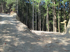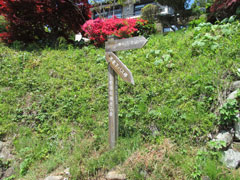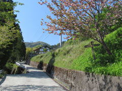 山の斜面に民家が点在するのでしばらく車道を右、左とカーブしながら登って行くと左に道路が分かれているので左に歩いて行き桑久保西で不老下バス停からの道と合流して僅かに行くと民家の石垣の手前から山に登って行く林道があり不老山の標識もある。林道の終点がお墓になっていて此処から登山道になる。