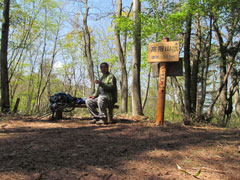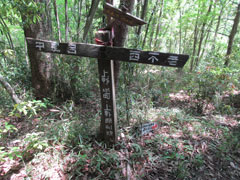 高指山山頂で小休止。此処にも不老山と同じ標識があり権現山方面の標識は有るが右手に降る標識は見当たらない。境の標柱、ピンク色のテープもあり、登山道もハッキリしているので迷う事無く降って行ける。初めは自然林の明るい緩やかな登山道で気持ちよく歩けたが次第に植林帯に変わり急斜面のジグザグに変わる。