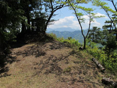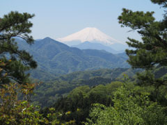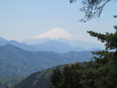 植林帯の中をしばらく登ると右手からの登山道を合わせて再び植林帯の中を登って行くと尾根筋に出て展望の良い所に金比羅宮と書かれた鳥居と社が有り南側は開けていて正面に丹沢、右手に富士山が良く見える。此処で水分の補給と景色を眺めながら小休止。