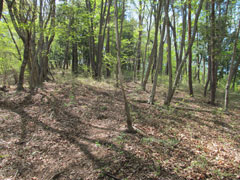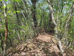此処からは尾根筋に沿って登って行き左手の尾根からの登山道と合流して登って行く植林帯から自然林に変わり陽当たりは暑いが風が冷たいので気持ち良く登って行く事が出来る不老山の手前で再び植林帯に入って東方向に登って行くと標高893mの不老山山頂に出る。此処も南側のみ開けていて丹沢山から右手の富士山までの展望がある。