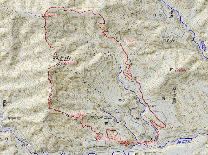 甲東保育所前駐車11:00→桑久保西登山口→金比羅宮11:40→不老山12:25〜12:50→高指山13:15→林道(和見峠)14:00→甲東保育所前駐車14:37