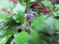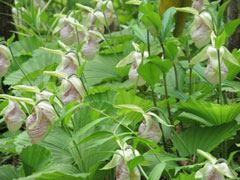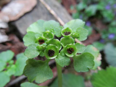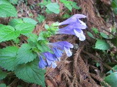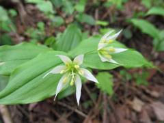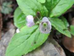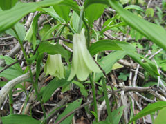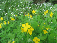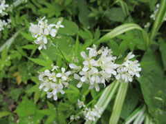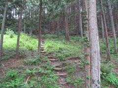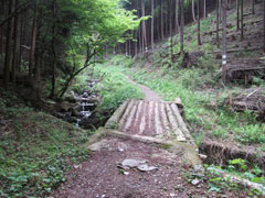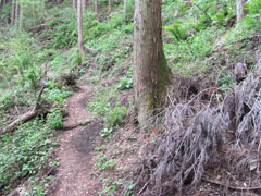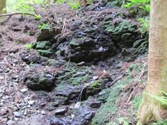 時折陽が射す新緑の中気持ちよく歩ける。登山道もはっきり踏み跡があり沢沿いの道は色々の花も見られる。沢の流れと木陰の道で夏の登山は利用価値があるコースだ。沢にそって20分ほど歩くと沢の突き当りで左手に岩から垂れ落ちる水場がある。