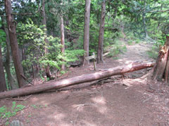 景信山山頂で軽い昼食を済ませてから山頂を一回り、八重桜の枝先に小仏城山から高尾山の山並みが続く。高尾山方向に向かってトイレ棟の際を降って行く。右手に小仏へ降る登山道を見送り、真っ直ぐ降って行くと倒木で直進は塞がれて左のザリクボ(小下沢)へ降る様に示している。今日は此処を直進して大久保山目指す。