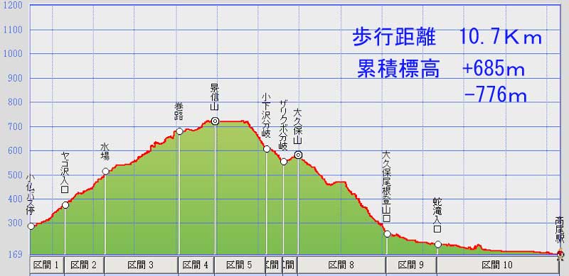 コース 高尾駅⇒小仏バス停10:35→ヤゴ沢入口10:50→水場11:11→分岐(巻路)111:49→景信山12:05〜12:25→ザリクボ分岐12:42→大久保山12:50→大久保尾根登山口13:35→蛇滝入口14:05→高尾駅15:10