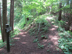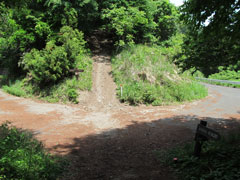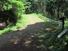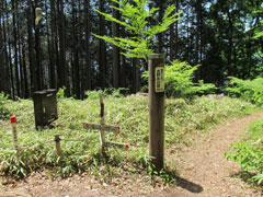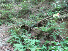 藤野駅から相模湖方面に戻り吉野から左に折れて中央高速の上を渡り、車道を道なりに登って行き右にカーブして緩やかに下ると左手に朽ちた登山道の標識がある。林の中に入り沢に沿って登って行くと右手に明王峠と書かれた標識に従って沢筋から外れて尾根筋の道をジグザグに登って行く。藤野駅から奈良本までは車道の歩きで一汗かいたが植林帯の中は直射日光を遮られて涼しく感じる。